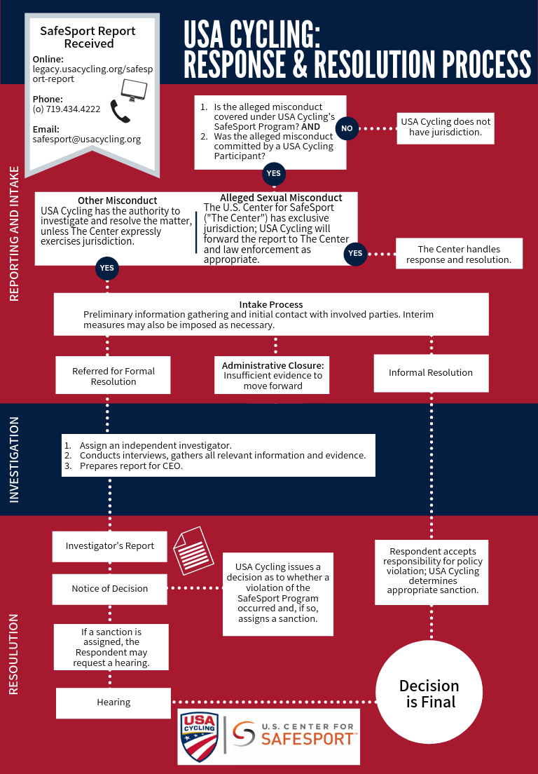 USA Cycling encourages everyone to report suspected misconduct, while some members are explicitly required to report misconduct. Multiple avenues for reporting suspected SafeSport violations are available, including anonymous and confidential options. Policy III – Grievances outlines the process that is followed when a SafeSport allegation within USA Cycling’s jurisdiction is received by USA Cycling.